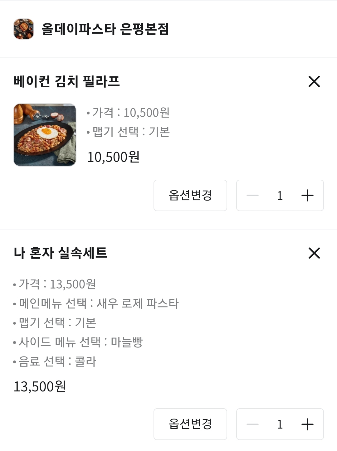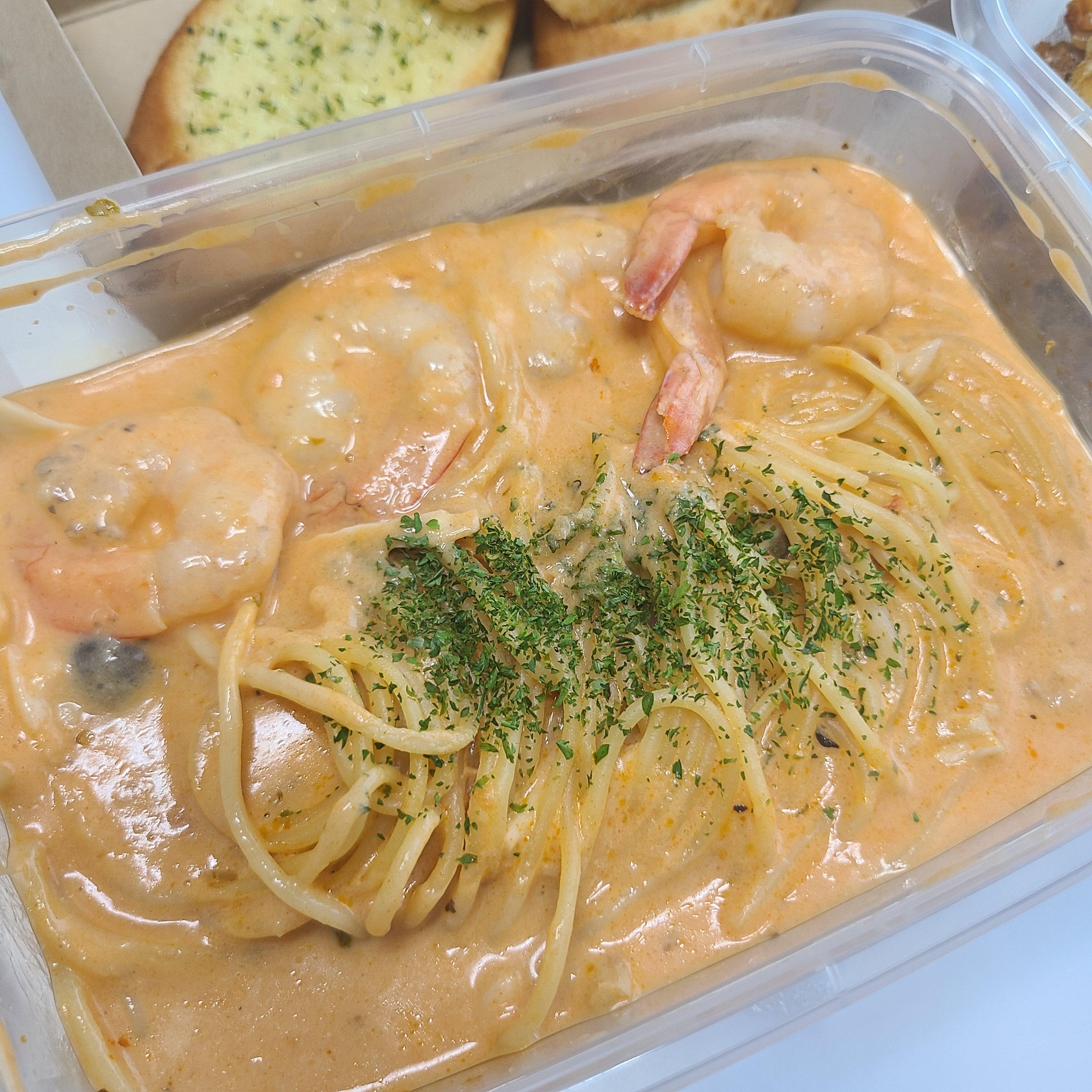 -. 나혼자 실속세트(새우로제파스타 기본맛 + 마늘빵 + 콜라250ml) : 13,500원