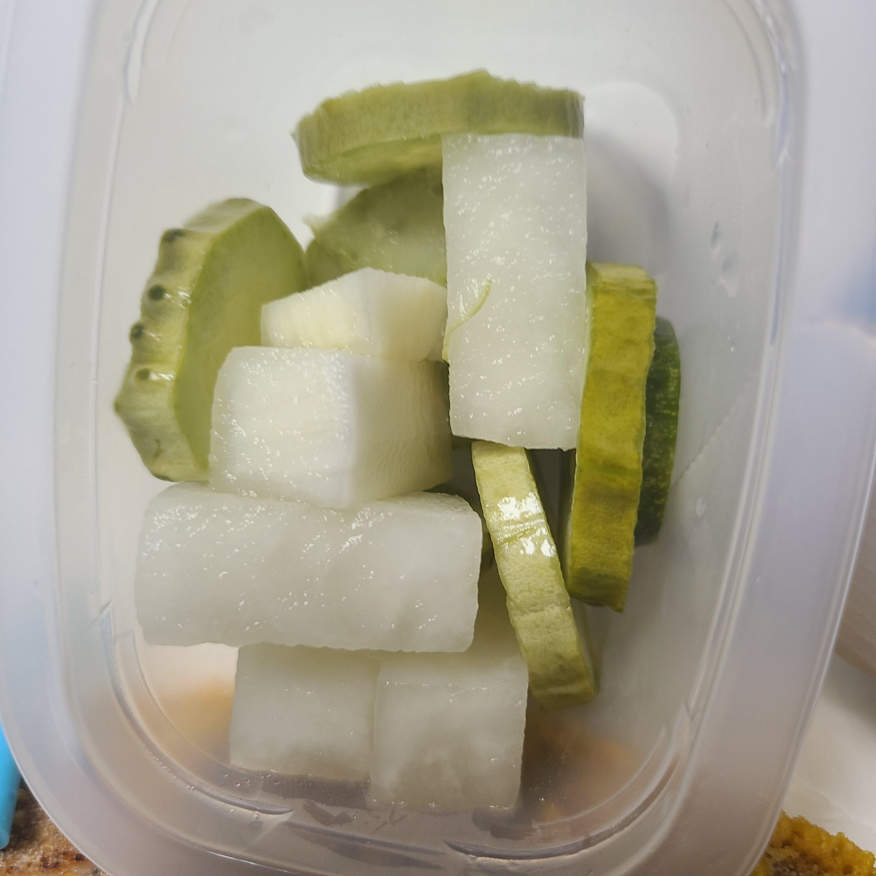 우리 농산물로 만든 계절피클은 자극적이지 않은 맛으로 짜지 않아서 피클만 먹을 수도 있습니다.